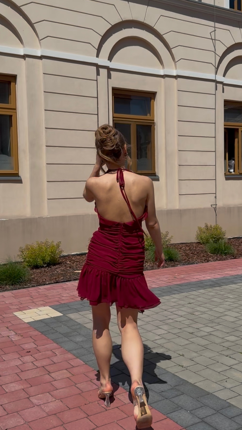 DANI to bordowa mini. Sukienka posiada głębszy dekolt w stylu halter wiązany na szyji. Biust dodatkowo zdobi mała aplikacji 3D w kształcie róży. Całość sukienki jest drapowana. Kobiecego charakteru nadaje delikatna falbanka na końcu spódnicy.