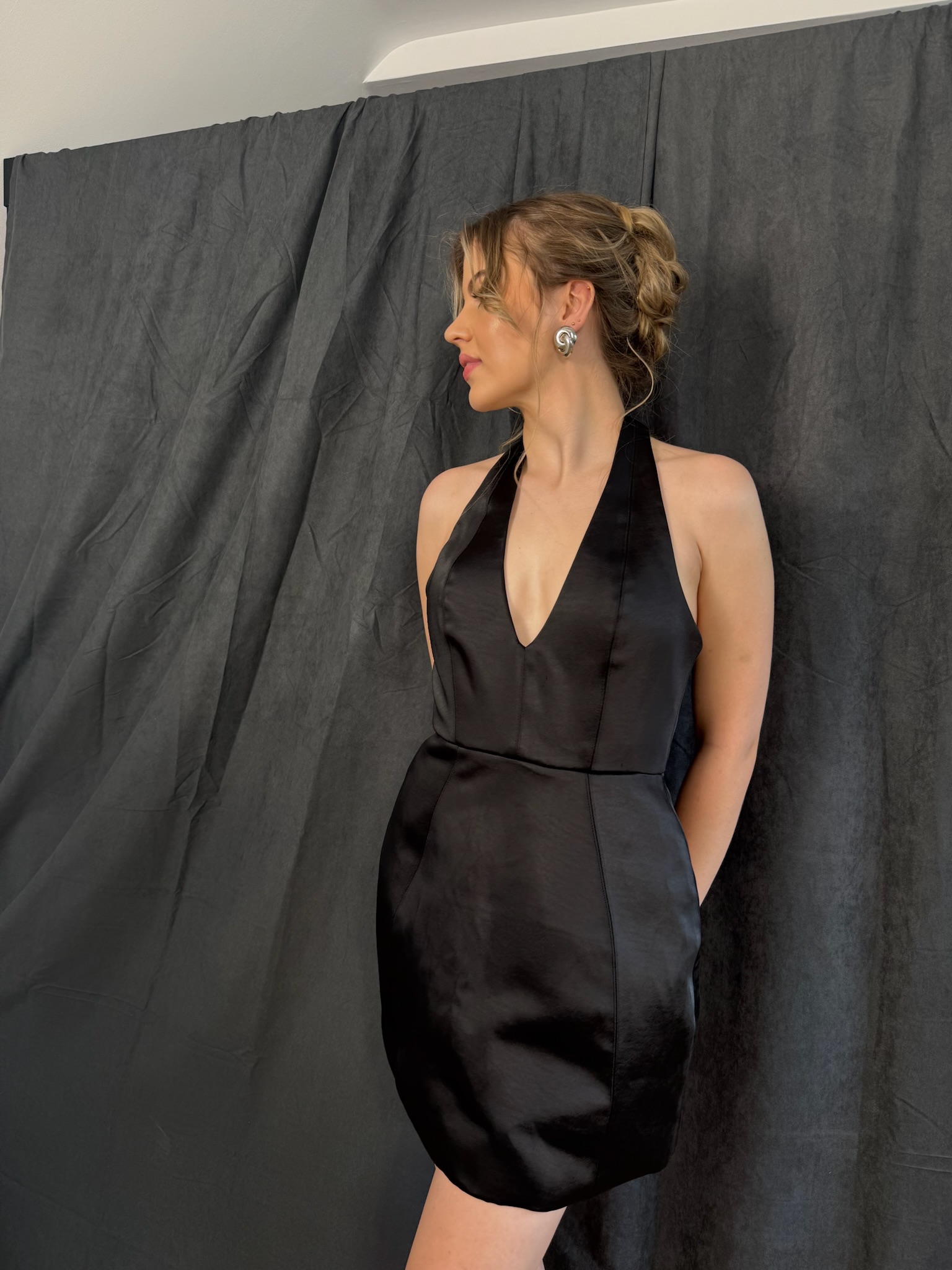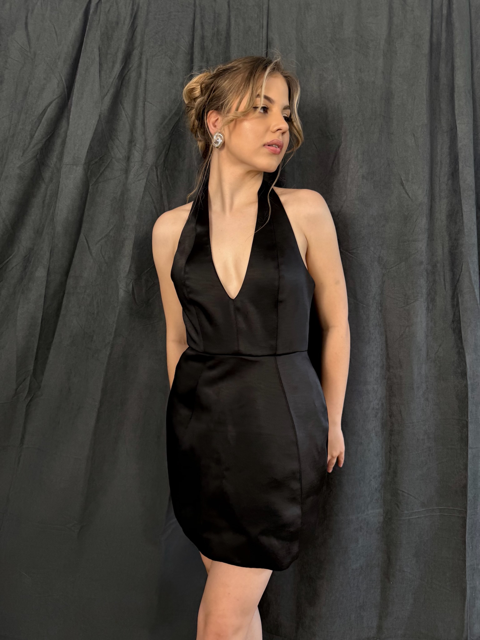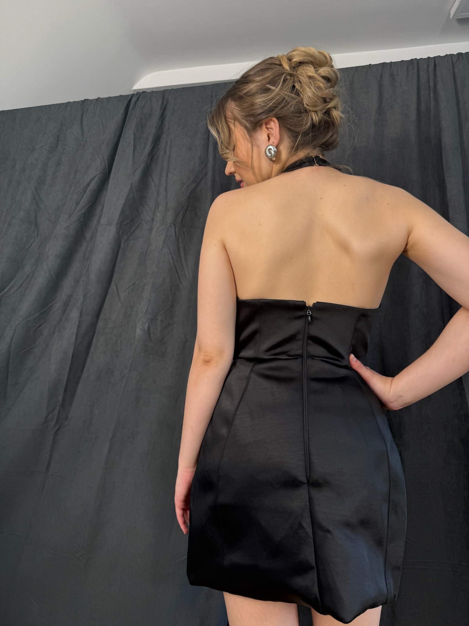 GLORIA to zjawiskowa mała czarna. Stylizacja posiada głęboki dekolt w kształcie łezki. Dół sukienki tworzy spódnica w kształcie bombki. Gloria jest zapinana z tyłu na szyi i posiada suwak.