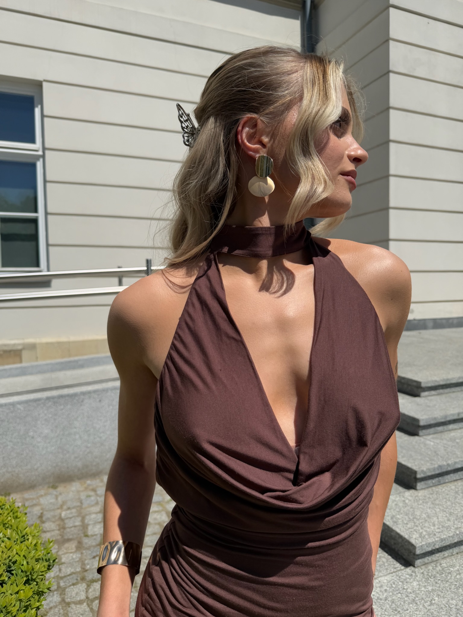 KAIA to brązowa midi. Sukienka jest wykonana z elastycznego i rozciągliwego materiału. Stylizacja posiada głęboki dekolt w stylu halter zapinany z tyłu na guziki. Charakteru sukience nadaje lejący materiał wzdłuż dekoltu oraz opięta spódnica.