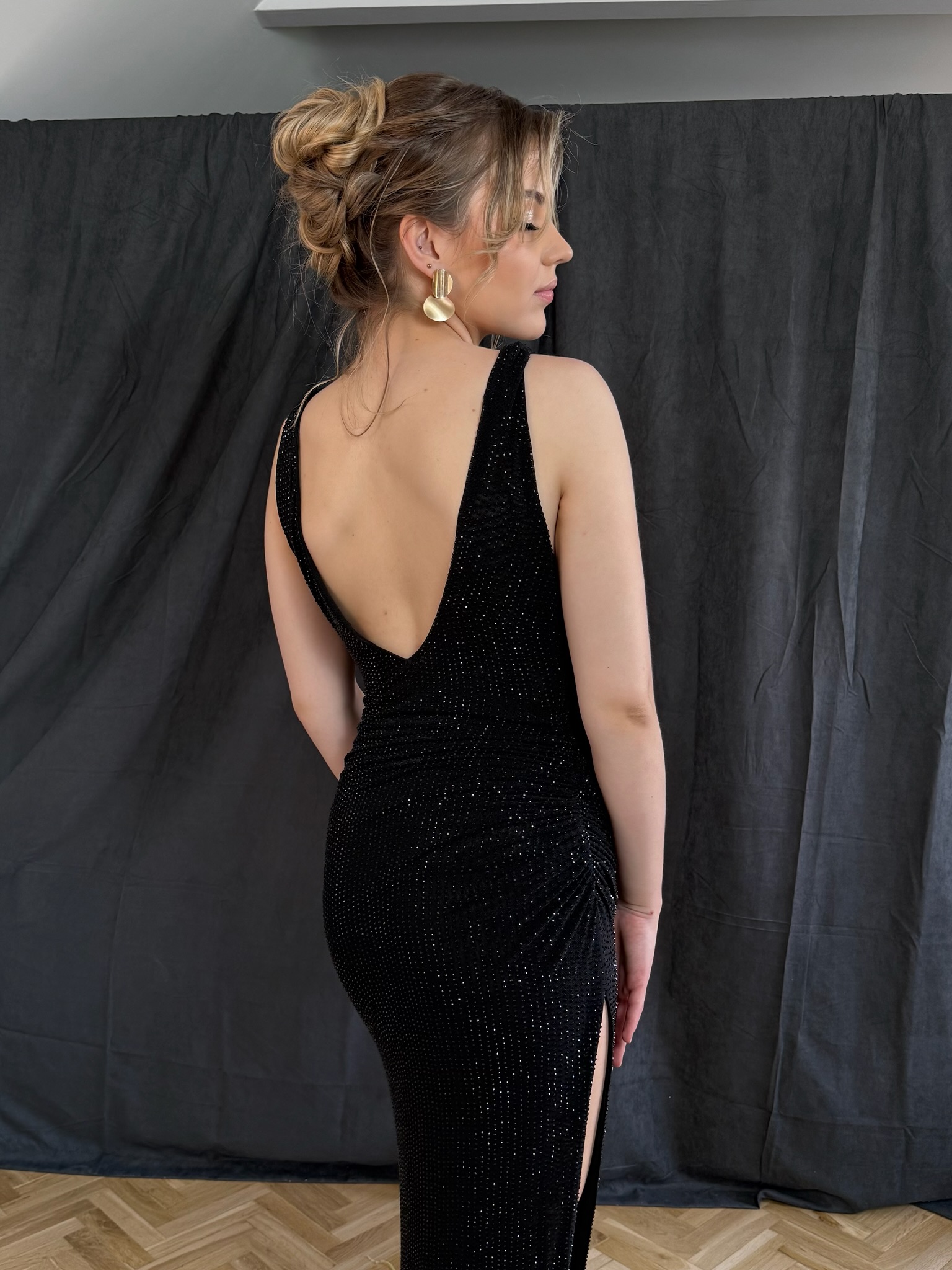LANEY to czarna maxi pokryta cekinami. Stylizacja posiada głęboki dekolt. Dodatkowe charakteru nadaje sukience rozcięcie na udzie. Całość kreacji dopełnia marszczenie w talii. LANEY posiada również mocno wycięte plecy.