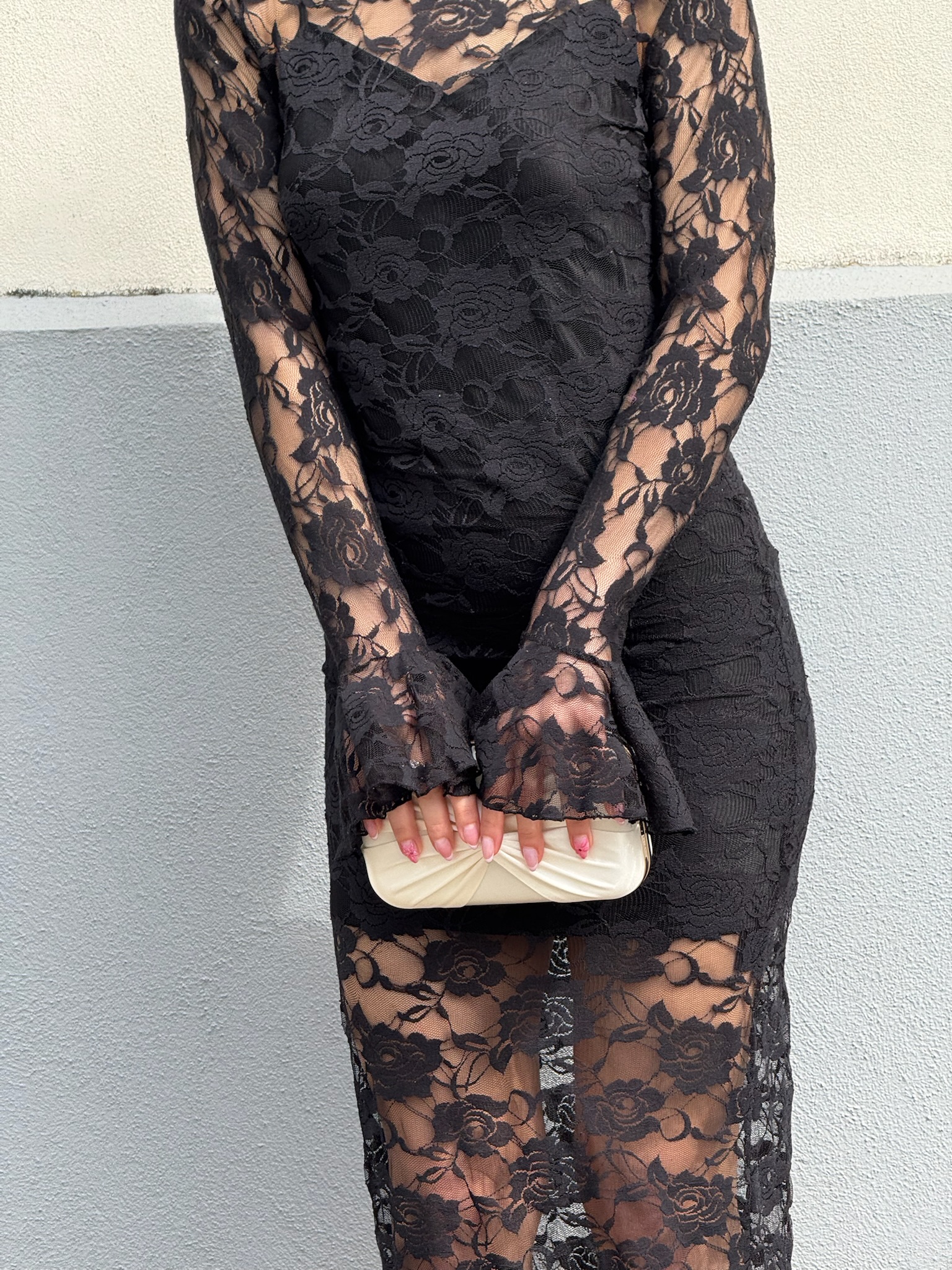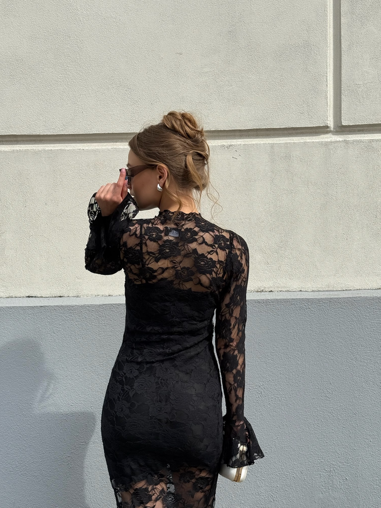 LIV to czarna midi. Sukienka składa się  z halki i sukienki koronkowej. Całość stylizacji dopełniają luźno zakończone rękawy i nieco wyższy kołnierzyk.